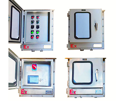 帶防護門的防爆配電箱使用于戶外天氣,雨水沙塵,拋光,噴塑,粉塵較多的環境中,有效阻止粉塵進入箱體表面,影響箱子的使用效果增加配電箱的使用壽命。 快開門防爆箱本產品采用304不銹鋼焊接而成,板材厚度在5MM以上。防爆配電箱,一般用不銹鋼或鋼板焊接,也可以用鋁合金壓鑄。防爆電柜有兩種類型:IIC級防爆電柜和IIB級防爆電柜。通常,防爆電控箱是一種復合結構,也就是說,它由一個防爆腔(主腔)和一個增安型腔組成。其中小型斷路器、塑殼斷路器、熱繼電器、交流接觸器、電涌保護器、電動機保護器等元件可安裝在隔爆腔內,防爆按鈕、防爆指示器、防爆轉換開關、防爆儀表等可安裝在增安型腔內。